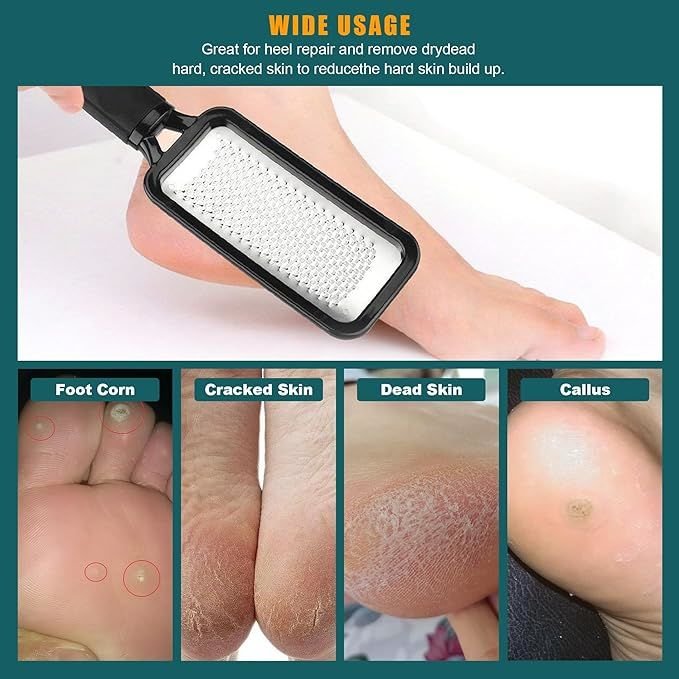 [HIGH-QUALITY MATERIAL]Made of professional stainless steel, the foot file set are washable and reusable. Foot file rasp handle is made of high end materials with non slip frosted texture to provide extra good grip.