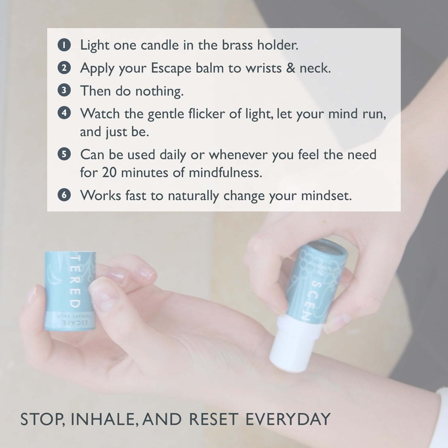 ESCAPE FROM A BUSY MIND WITH 20 MINS OF MINDFUL MEDITATION - This 'Mindful Escape' relaxation and meditation set includes our Escape Aromatherapy Balm (1.5g) and 12 x pure beeswax Meditation Candles. Each candle burns for 20 minutes, allowing you to switch from your busy day and practice mindfulness and self care.,PURE BEESWAX MEDITATION CANDLES WITH ENGRAVED BRASS HOLDER - The 12 x Meditation Candles are made from beeswax, a pure natural ingredient that provides a clean burn whilst emitting negative ions that clean and purify the air with a gentle honey aroma. Includes a re-usable brass candle holder engraved with a reminder to: Stop. Inhale. Reset.,ESSENTIAL OIL BLEND AROMATHERAPY ESCAPE BALM: 100% NATURAL - The Escape balm is an all-natural aromatherapy essential oil blend of Oud, Frankincense, and Sandalwood. Ideal meditation aid that promotes peace, tranquility, relaxation, and clarity. Helps you 'escape' from your busy schedule, and allows you to unwind.,STOP, INHALE & RESET EVERYDAY - Light one candle in the brass holder, and apply your Escape balm to wrists and neck. Then do nothing. Watch the gentle flicker of light, let your mind run, and just be. Can be used daily or whenever you feel the need for 20 minutes of mindfulness. Works fast to naturally change your mindset.,SELF-CARE & AROMATHERAPY ON THE GO: THOUGHTFUL GIFT IDEA - Use for a needed dose of self-care, or gift to those who struggle to 'switch off' at the end of the day. Comes is a re-usable travel tin for aromatherapy wherever you go. Balm is 1.5g and the 12 x candles are 7mm diameter and 70mm long.